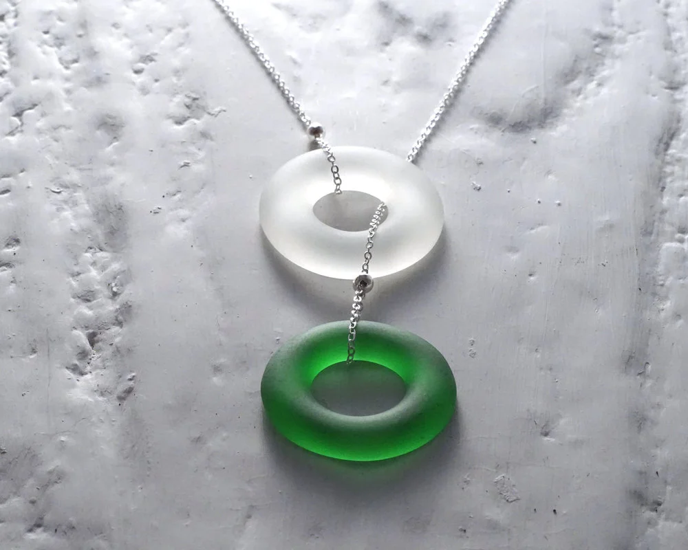 I cut and melted both bottles, then tumbled them to a sea-glass finish. The pendants are simply strung on a fine silver-plated cable necklace.